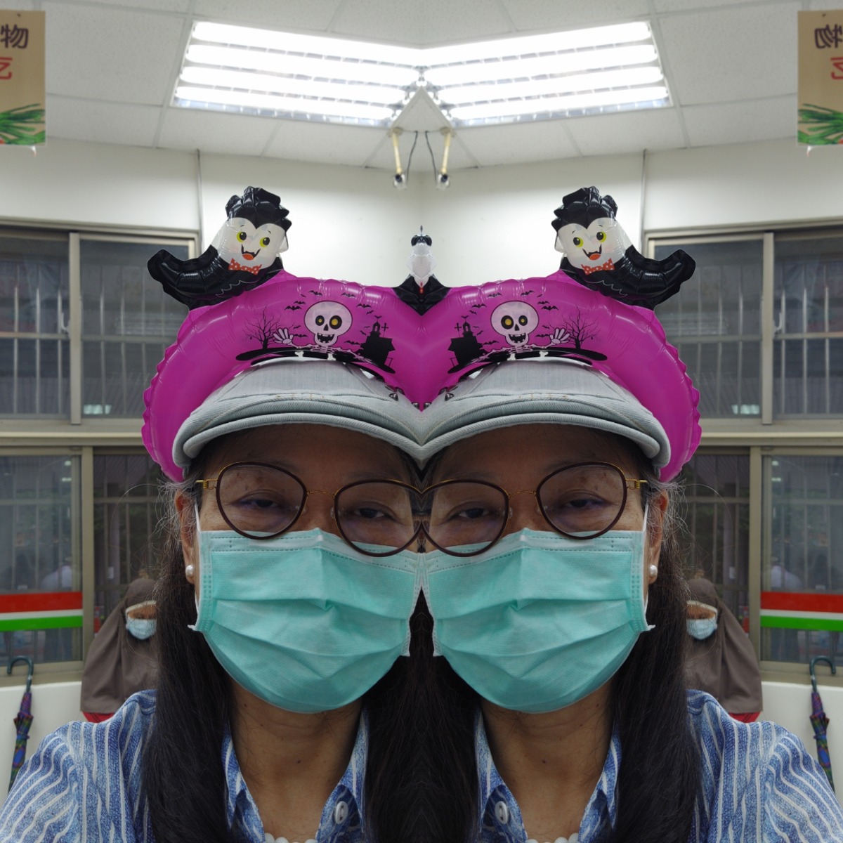 小女鵝的居家與外出服,很多都是接手姊姊的;那都是發生在她下凡前,她也搞不清楚,外加老母我又是自由亂搭多層次帽T穿衣風,於是留下了這張公園裡的留影紀念照片。